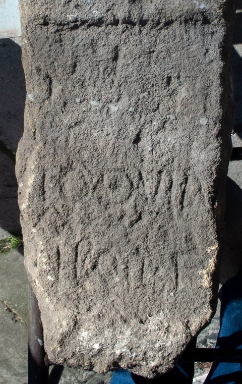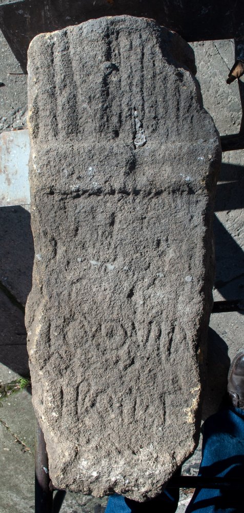 - Schriftfeld mit profiliertem Rahmen, darüber Rest eines Relieffeldes (Brustbilder ?).
