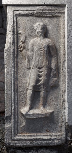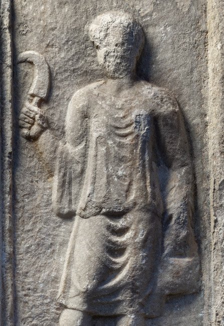 - Auf der gerahmten rechten Nebenseite Diener: auf Podest Mann in kurzer Tunica, in der Rechten Winzermesser, in der Linken Korb.