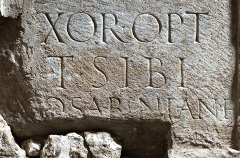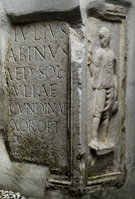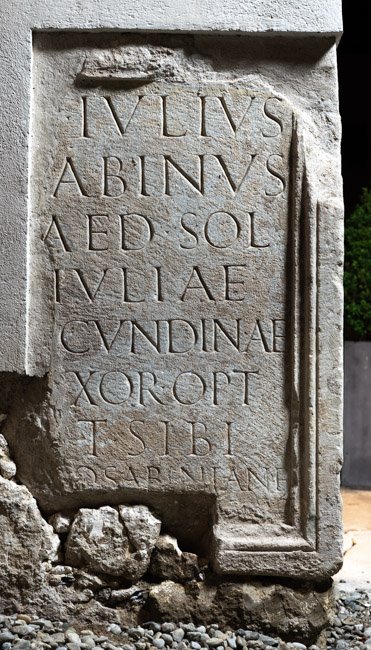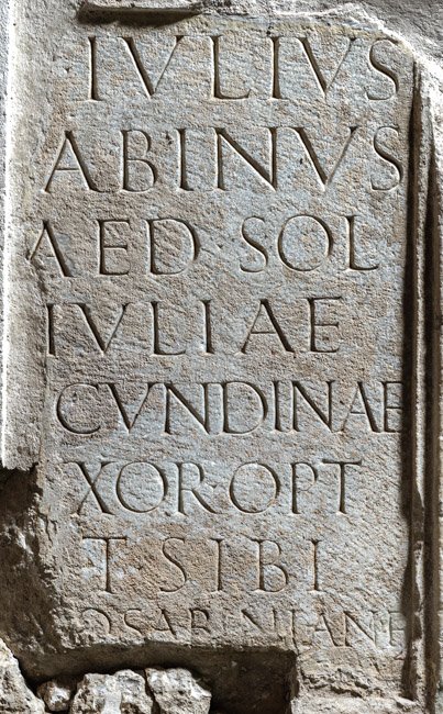 - [-] Iulius / [S]abinus / aed(ilis) Sol(vae) / Iuliae / [Se]cundinae / [u]xor(i) opt(imae) / [e]t sibi / [et Iuli]o Sabiniano f(ilio) / [an(norum) ---]