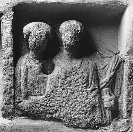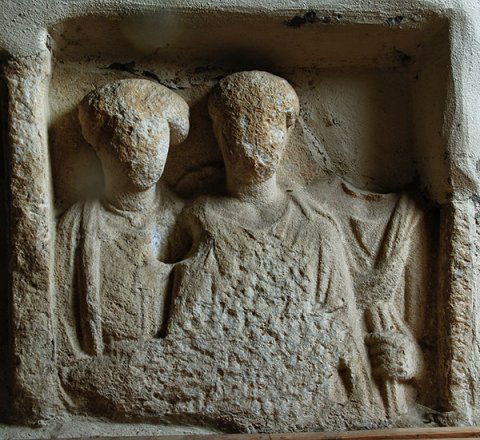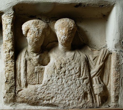 - Zwischen Säulen drei Brustbilder einer Familie. Links einheimische Frau: Haube, Umhang, Doppelknopffibeln, Brosche, Halskette mit Lunula. In der Mitte Mann, rechts Mann: Tunica, Toga, in der Linken Rolle (volumen). Auf der linken (und wahrscheinlich auch auf der rechten) Nebenseite Pflanzenkandelaber.