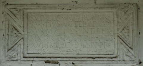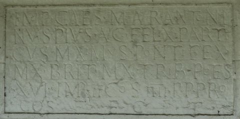 - Imp(erator) Caes(ar) M(arcus) Aur(elius) Antoni/nus Pius Aug(ustus) Felix / Part(h)i/cus maximus pontifex / max(imus) Brit(tannicus) max(imus) trib(unicia) potes(tate) / XVI imp(erator) II co(n)s(ul) IIII p(ater) p(atriae) pro/co(n)s(ul) fecit