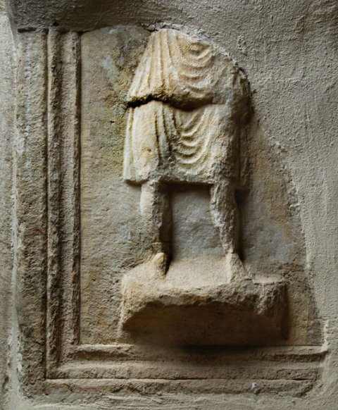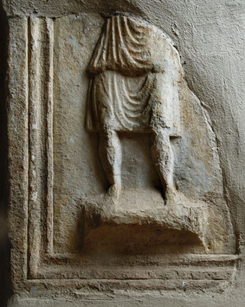 - Auf rechter Nebenseite Diener: auf flachem Podest Mann in kurzer Tunica