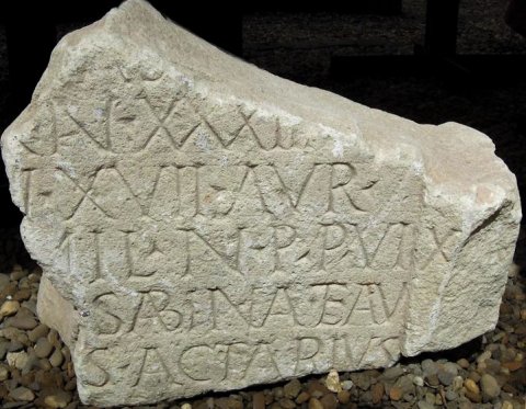 - [D(is)] M(anibus) / [---]us vet(eranus) ex [--- vix(it) a]n(nos) LXXXV mil(itavit) / [--- P]asser sig(nifer) / [--- vix(it)] an(nos) XXXIII Ael(ia) / [--- vix(it) a]n(nos) XVII Aur(elius) / [---] mil(es) n(umeri) P(almyrenorum) P(orolissensium) vix(it) / [--- Au]r(elia?) Sabina et Au[rel(ius) ---]us actarius / [---