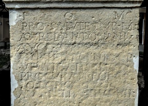 - I(ovi) O(ptimo) M(aximo) / pro salute Imp(eratoris) M(arci) / Aurel(i) Antonini / Aug(usti) [[Commodi]] / [[Sarm(atici) Ger(manici)]] et Genio p(ublici) p(ortorii) / vectigalis Illyr(ici) / procurante Pompe/io Longo proc(uratore) / Aug(usti) Felix et Luc(ius) vil(ici)