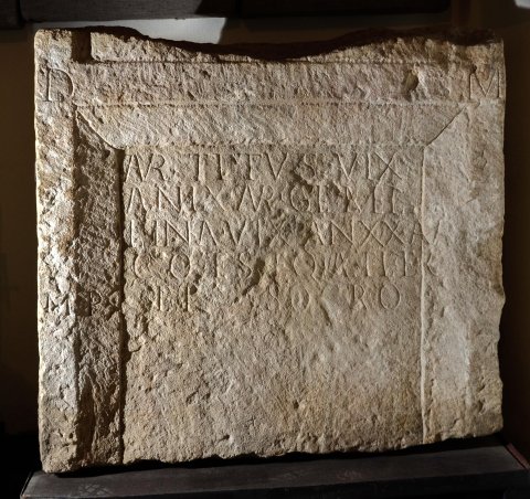 - D(is) M(anibus) / Aur(elius) Titus vix(it) / an(nos) LX Aur(elia) Gemel/lina vix(it) a(nnos) XX Aur(elius) / Cotes eq(ues) al(ae) Fl(aviae) f(aciendum) c(uravit) / m(aritae) p(ientissimae) et socro(!)