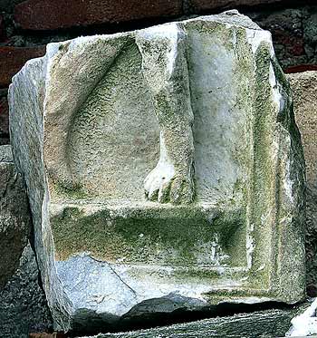 - Profiliert gerahmtes Bildfeld mit Unterschenkeln einer mit gekreuzten Beinen auf einem Podest stehenden Figur (Genius? Satyr?).