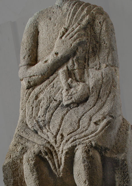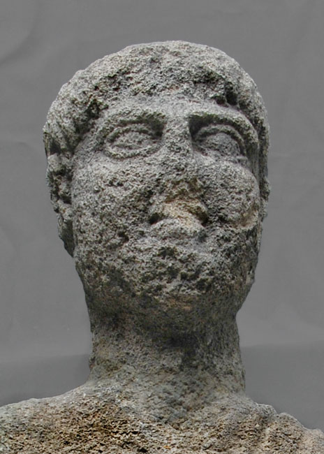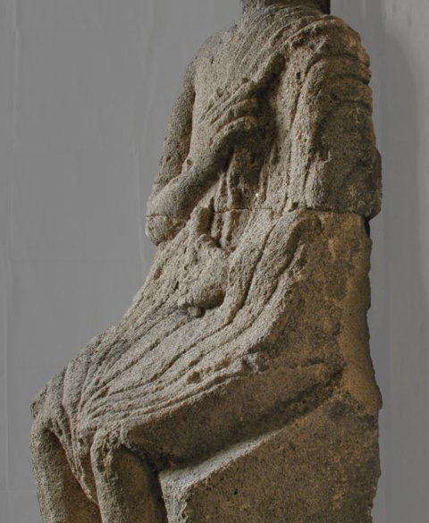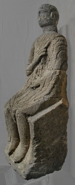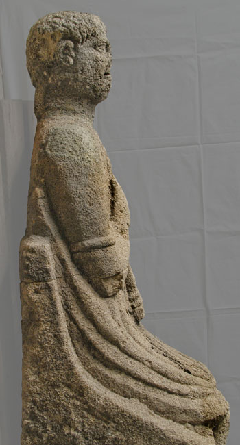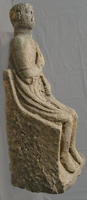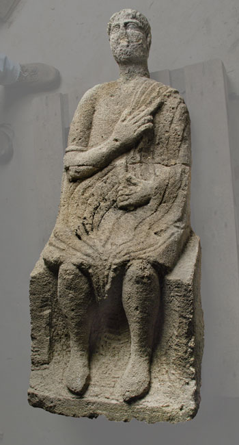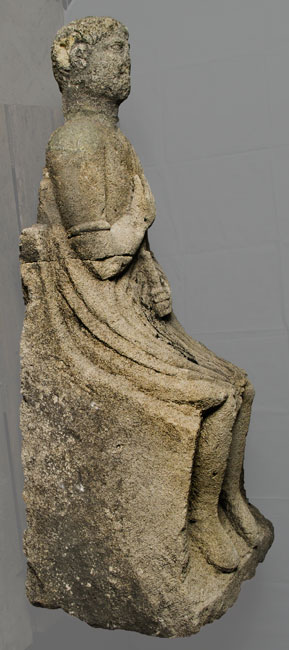 - Statue eines sitzenden bartlosen Mannes im Mantel, um den rechten Oberarm Reif, Fingerring, in der Linken Rolle (volumen). Sessel mit Rückenlehne.