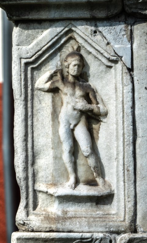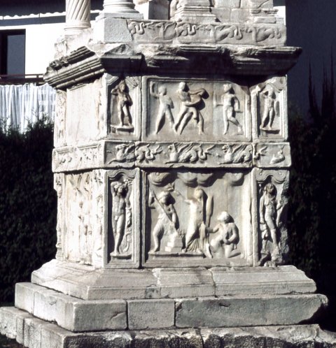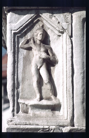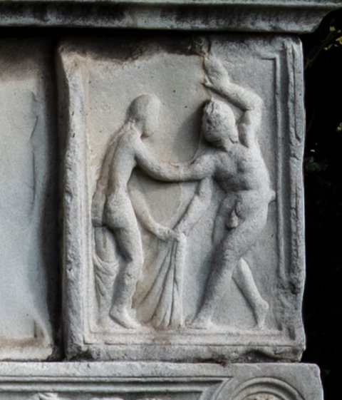 - Eckblock rechts von der Inschrift in der oberen Zone des Untergeschosses. Mythische Figur: Auf der Vorderseite profiliert gerahmtes Rechteckfeld, darin Satyr, der einer Mänade das Gewand wegzieht. Auf der rechten Nebenseite profiliert gerahmtes Bildfeld mit Giebel, darin auf niedrigem Podest stehender nackter Heros mit Helm, der sich den Schwertgurt umlegt.