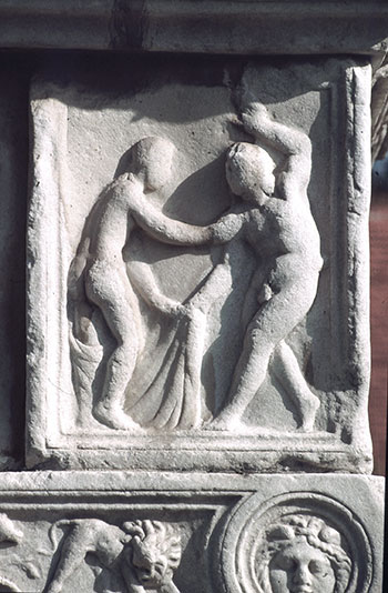 13258 Reliefblock mit Satyr, Mänade und Heros von der Grabaedicula der Spectatii