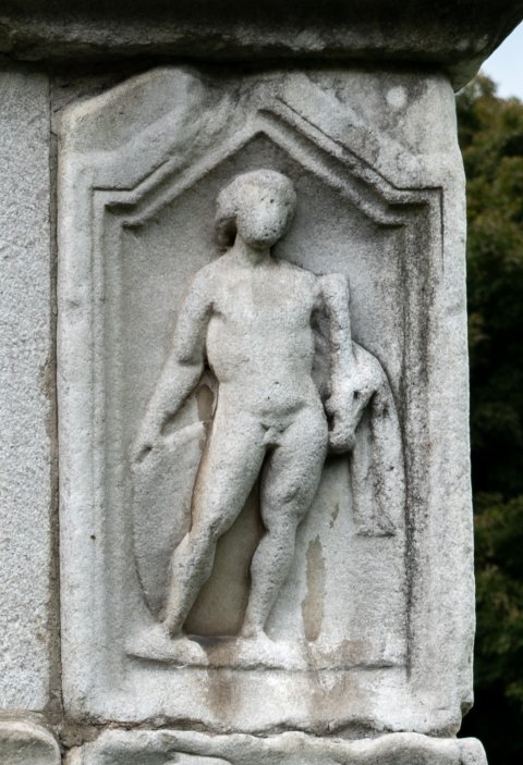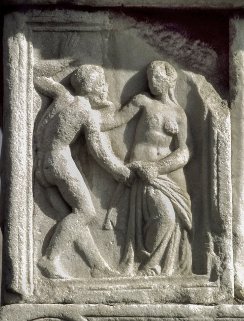 - Eckblock links von der Inschrift in der oberen Zone des Untergeschosses. Mythische Figur: Auf der Vorderseite profiliert gerahmtes Rechteckfeld, darin bärtiger Satyr, der einer Mänade das Gewand wegzieht. Auf der linken Nebenseite profiliert gerahmtes Bildfeld mit Giebel, darin auf niedrigem Podest stehender nackter Herakles (Hercules) mit Löwenfell über dem linken Arm, in dem er die Keule hält, rechte Hand auf einem Schild.