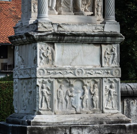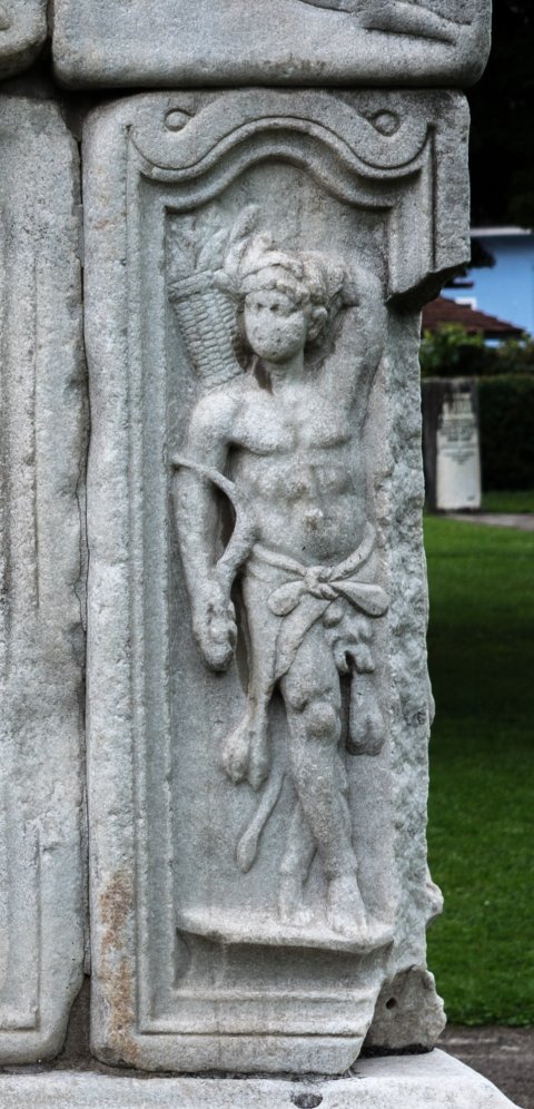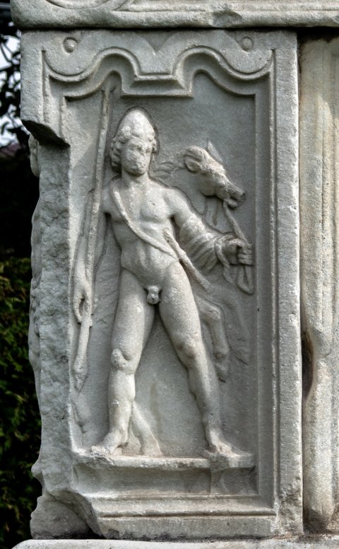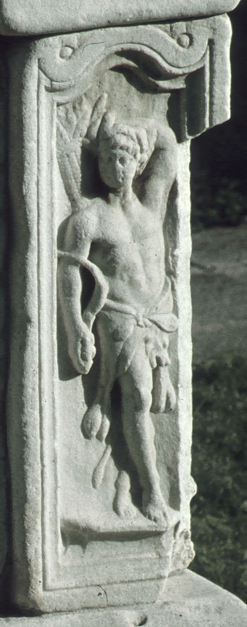 - Linker vorderer Eckblock in der unteren Zone des Untergeschosses. Mythische Figur. Auf der Vorderseite Dioskur mit Pileus vor seinem Pferd, das er mit der Linken am Zügel hält, im rechten Arm Speer, über der Brust Schwertgurt, Schwert an der linken Hüfte. Auf der linken Nebenseite Jahreszeitenpersonifikation mit Sichel und Korb mit Ähren (Sommer).