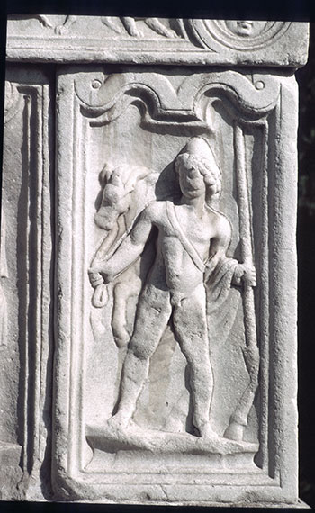- Rechter vorderer Eckblock in der unteren Zone des Untergeschosses. Mythische Figur. Auf der Vorderseite Dioskur mit Pileus vor seinem Pferd, das er mit der Rechten am Zügel hält, in der linken Hand Speer, über der Brust Schwertgurt. Auf der rechten Nebenseite Jahreszeitenpersonifikation mit Kranz aus Weinlaub und Früchtekorb (Herbst).
