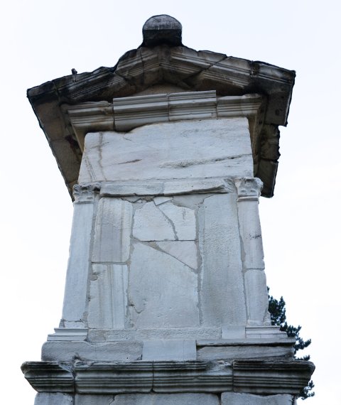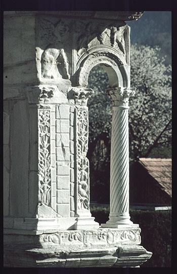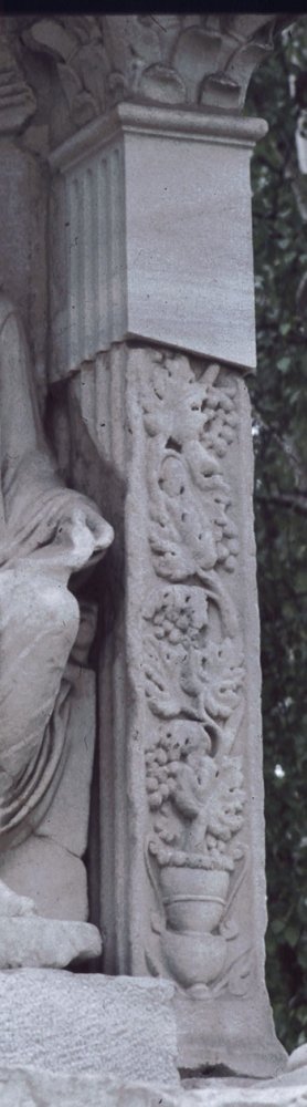 - Auf den Außenseiten Wand mit Quaderimitation zwischen Pilastern mit Blattkandelabern; beim vorderen Pilaster unten zwei Delphine und Muschelschale. Auf der Vorderseite der Pilaster Krater, aus dem Weinranke wächst, Pilasterinnenseite kanneliert. Kapitelle mit zwei Blattkränzen.