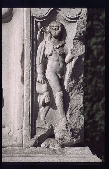 - Hinterer Eckblock der rechten Nebenseite in der unteren Zone des Untergeschosses. Mythische Figur: profiliert gerahmtes Bildfeld, darin auf niedrigem Podest nach rechts schreitende Jahreszeitenpersonifikation (Winter), in der Rechten Hase, in der Linken geschulterter Stock.