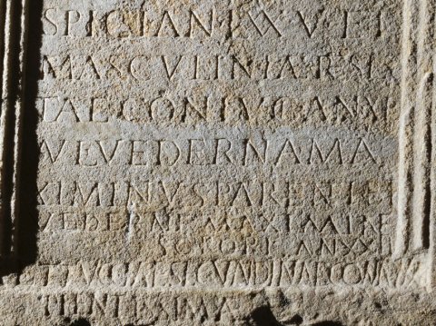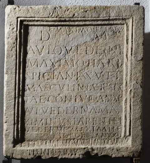 - D(is) M(anibus) / Aulo Vedern(a)e / Maximo hari/spici an(norum) LXXV et / Masculiniae Res(p)ec/tae coniug(i) an(norum) XL / Aul(us) Vederna Ma/ximinus parentib(us) et / Vedernae Maximinae / sorori an(norum) XXII / et Tucciae Secundinae con(iugi) a(nnorum) XXX // pientissimae // et Maximo fil(io) an(norum) XXX