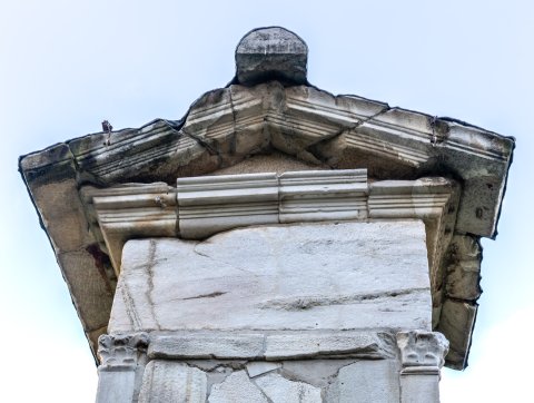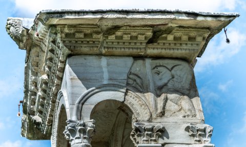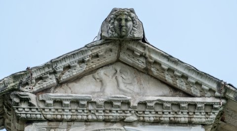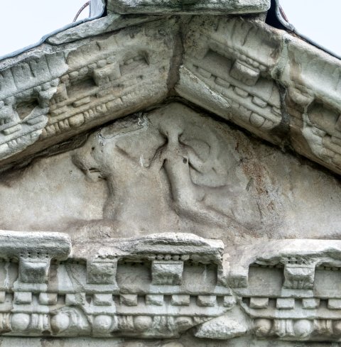 - Das Dach besteht aus zwei Dachplatten, einem Firstbalken mit Gorgoneion am Balkenkopf sowie zwei Giebelfeldern; auf dem vorderen Meerwesen (Nereide auf Seepanther).
