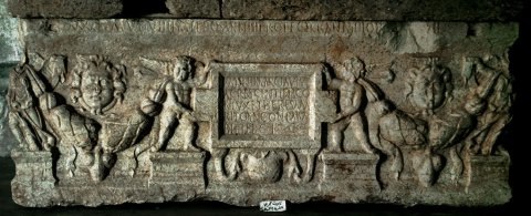 In der Mitte der Vorderseite über einem Gefäß mit Ranken (?) gerahmte tabula ansata mit der Grabinschrift. Die ansae halten zwei nackte Genien, die auf Podesten stehen. Von ihrem Nacken geht jeweils eine Girlande aus, im Girlandenbogen je ein Gorgoneion. An den Ecken je ein Podest mit bewegter Victoria, die das Ende der Girlande trägt.