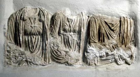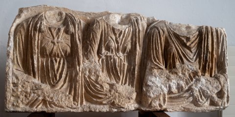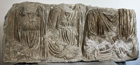 - Drei Halbfiguren einer Familie. Links einheimische Frau (Mutter): gegürtetes Gewand, Fibeln, Brosche, Umhang. In der Mitte Frau (Tochter): gegürtete Tunica mit geknöpften Ärmeln, Mantel. Rechts Mann: Tunica, Toga, in der Linken Rolle (volumen).