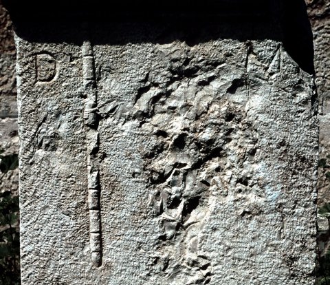 - Über der Inschrift stehender Soldat mit Stab in der Rechten.