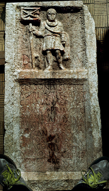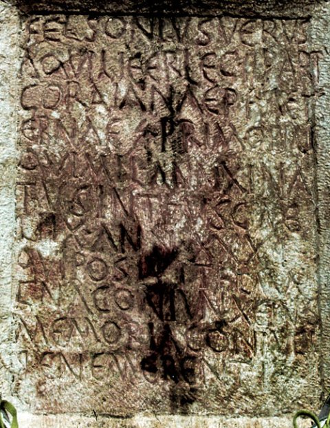 - D(is) M(anibus) // Felsonius Verus / aquilifer leg(ionis) II Par(thicae) / Gordianae P(iae) F(idelis) Aet/ernae |(centuria) prim<i=O> pil(i) / qui mil(itavit) ann(os) XI na/tus in Thusc(i)ae / vix(it) ann(os) XXXI qui pos{i}uit Fl(avia) Ma/gna coniunx eius / memoria coniugi / bene merenti