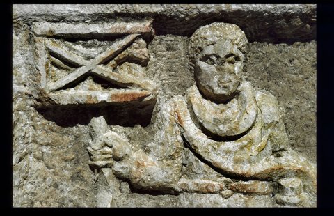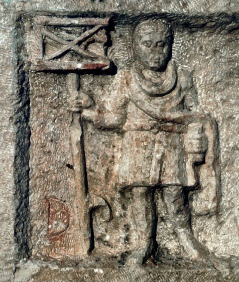 - Stehender Soldat, Sagum, Ärmeltunica, Gürtel mit Ringschnalle, in der Rechten Feldzeichen (signum) (Adler im Käfig), in der Linken Rolle (volumen).