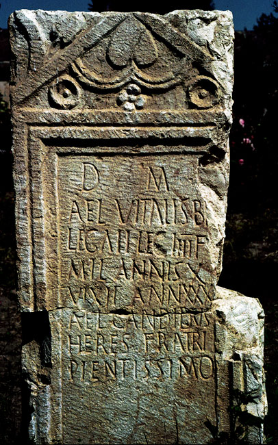 - D(is) M(anibus) / Ael(ius) Vitalis b(ene)f(iciarius) / legati leg(ionis) IIII F[l(aviae)] / mil(itavit) annis X / vixit ann(is) XXX / Ael(ius) Candidus / heres fratri / pientissimo