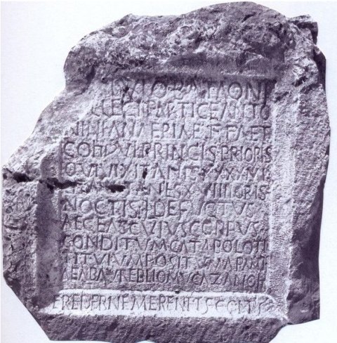 - [---]ivio Bataoni / mil(iti) leg(ionis) II Part(h)ic(a)e Anto/ninianae piae f(idelis) f(elicis) aet(ernae) / coh(ortis) VI princ(ip)is prioris / qui vixit an(n)is XXXX mi/litavit an(n)es(!) XVIII (h)oris / noctis II defu(n)ctus / Aegeas cuius corpus / conditum Catabolo / titulum positum Apam(e)ae / ab Aurelio Mucazano h//erede b(e)ne merenti fecit