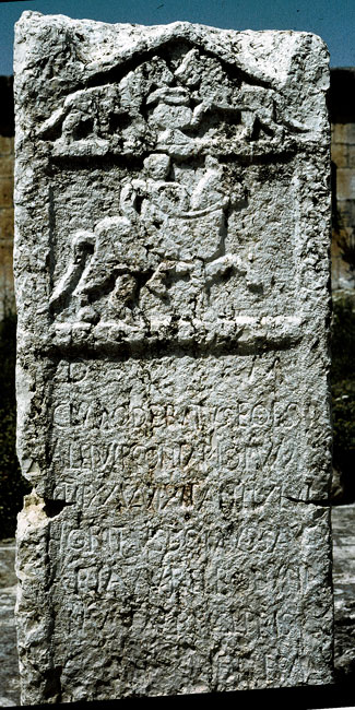 - Im Giebel Gefäß zwischen zwei Löwen. Im Bildfeld Reiter (Soldat).