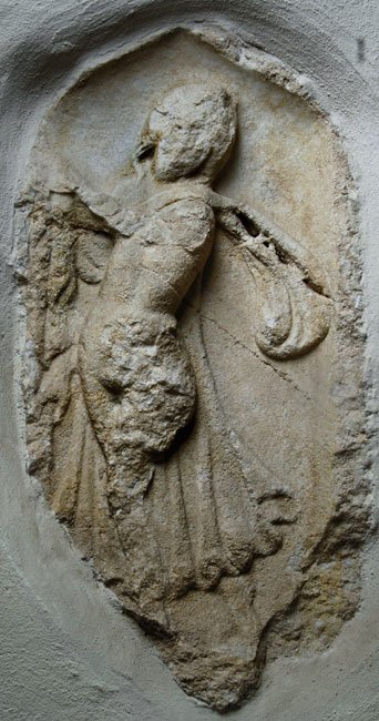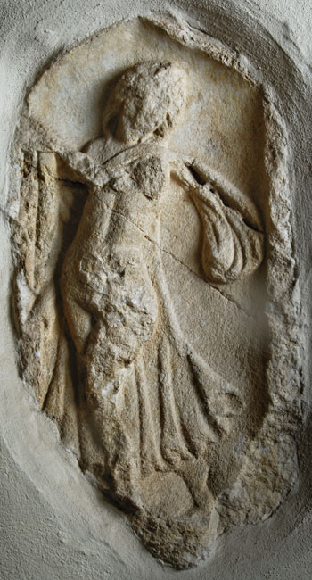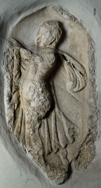 - Mythische Figur: in Bildfeld mit Giebel tanzende nackte Mänade, die Linke hält den Mantel, der über die Schultern nach hinten fliegt.