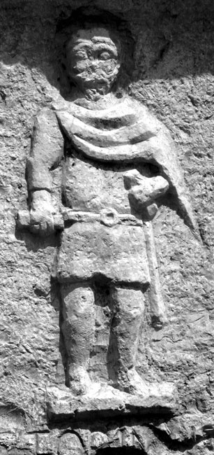 - Deckplatte mit kleinem Giebel zwischen zwei Rosetten. Über der Inschrift kleine Standleiste mit stehendem bärtigen Soldaten. Sagum, Tunica, Gürtel mit Ringschnalle, in der Linken Rolle (volumen), in der Rechten ? Waffen: Schwert an der linken Hüfte.