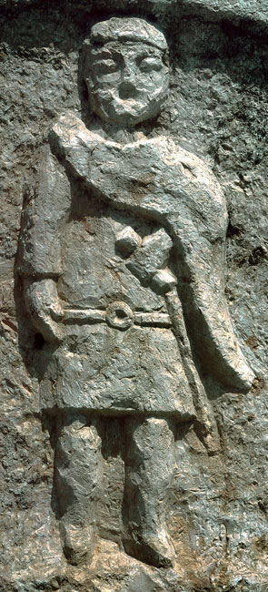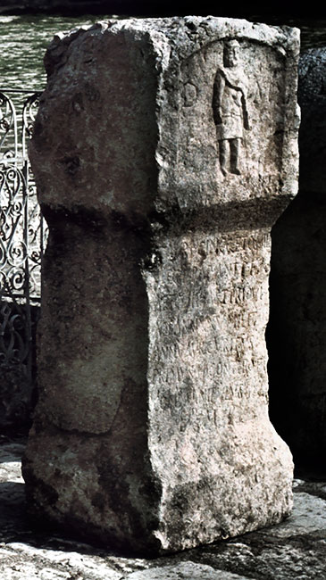 - Schaft mit Inschrift, darüber an drei Seiten vorspringender Block mit gerahmtem Bildfeldauf der Vorderseite: unter flachem Bogen stehender bärtiger Soldat. Sagum, Ärmeltunica, Gürtel mit Ringschnalle, in der linken Hand Rolle (volumen). Waffen: an der linken Hüfte Schwert.