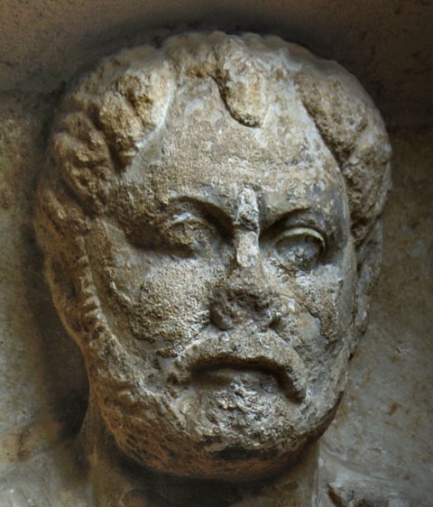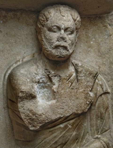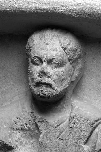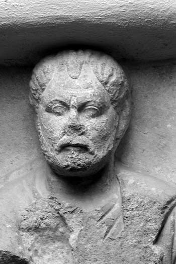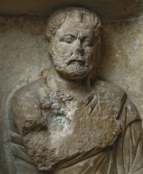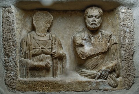 - In Rechtecknische zwei Halbfiguren (Ehepaar). Links einheimische Frau: gegürtetes Gewand, Brustschmuck mit drei Scheiben, Doppelknopffibeln, Umhang, Halsreifen mit Anhänger, Armreif, in der Rechten Blüte. Rechts Mann: bärtig, Altersfalten, Tunica, Toga contabulata.