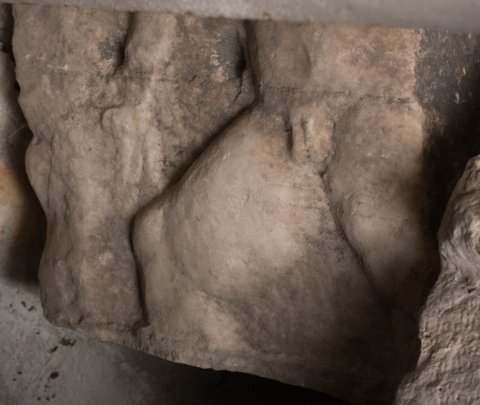 - Mythische Figur: Hüftpartie und Oberschenkel eines nach links gehenden nackten Satyrs mit nach hinten abgewinkeltem rechten Arm mit Stab.
