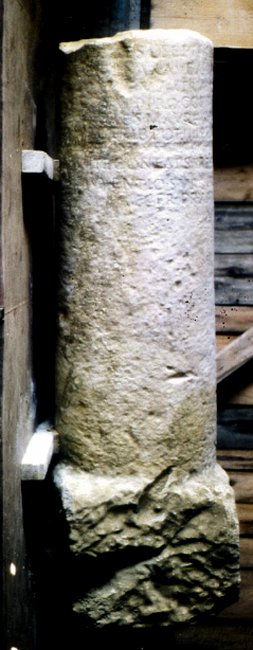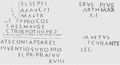 - [Imp(erator) Ca]es(ar) L(ucius) Septi[mius Sev]erus Pius / [Pertin]ax Aug(ustus) Ar[ab(icus) Adiab(enicus) P]arth(icus) max(imus) / [ponti]f(ex) max(imus) tr[ib(unicia) pot(estate) VIIII imp(erator)] XII / [c]o(n)s(ul) p(ater) p(atriae) proco(n)s(ul) [et [Imp(erator)] / Caes(ar) M(arcus) Aure[l(ius) Antoninu]s Pi[u]s / [Au]g(ustus) trib(unicia) pot(estate) IIII pro[co(n)s(ul) [[et P(ublius) Septimius Geta]]] / [[[nob(ilissimus) Caes(ar)]] milliar]ia vetus/[t]ate conlapsa res[tituerun]t curante / [M(arco)] Iuventio Suro Pro[culo] {leg} / [l]eg(ato) pr(o) pr(aetore) a(b) Iuv(avo) / [m(ilia) p(assuum)] XVIII