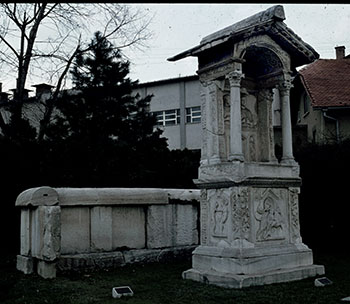 Grabaedicula. Obergeschoss: Satteldach, Firstbalken mit Gorgoneion. Deckenblock: tonnengewölbte Kassettendecke, die auf Seitenwangen mit Rankenpilastern und vorgestellten Säulen liegt. An der Rückwand der Nische oben Bogenfeld mit Kranz, darunter Gesims und Meerwesenfries. Paltte mit Porträtreliefs eines Ehepaares (oberes Register) und eines Mädchens zwischen zwei Trauergenien. Auf dem Sockelblock der Aedicula vorn tabula ansata mit Inschrift, seitlich Meerwesen-Friese.