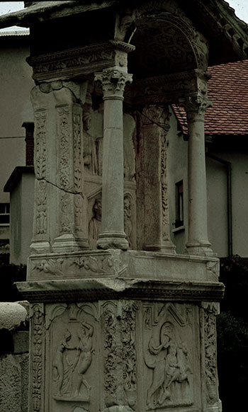 Untergeschoss: unterhalb des Gesimses auf Vorder- und Nebenseiten Reliefs mit mythischen Szenen, an den Ecken Pilaster mit Krater, Tieren und Weinranken bzw. Blattkandelabern. Profilierter Sockel, zweistufiger Unterbau. - Inschrift
