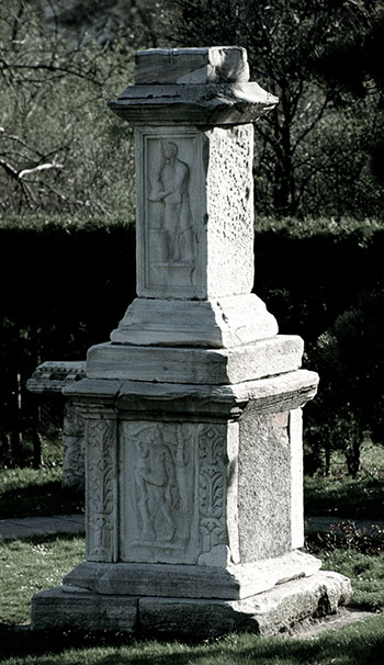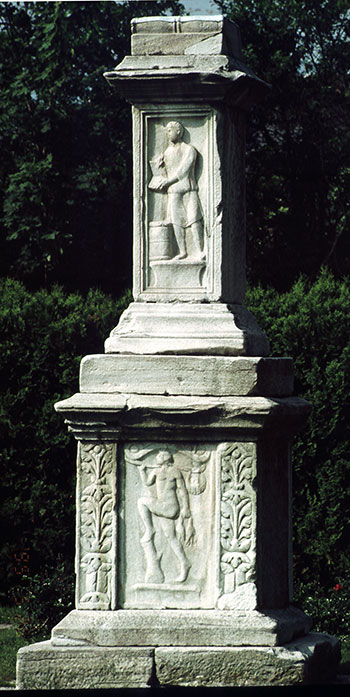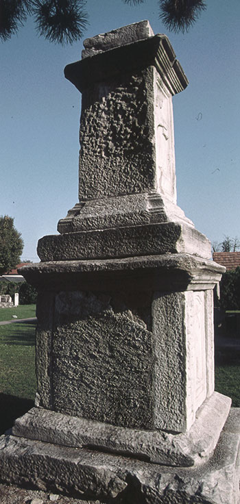 - Zweistöckiges Pfeilergrabmal. Untergeschoss aus Reliefblöcken zusammengessetzt: Herakles (Hercules) und Alkestis auf der Vorderseite, bekleideter Jüngling (Jahreszeit ?) mit Tier auf den Schultern auf der linken Seite, Jahreszeit (?) mit geschultertem Stock mit Jagdbeute auf der rechten Seite. Profiliertes Deckgesims, darüber Block mit DM auf der Vorderseite. Obergeschoss: Schaftblock mit Inschrift auf der Vorderseite, Diener (Librarius - Scriba) auf der linken, Dienerin auf der rechten Nebenseite. Profilierte Deckplatte, viereckiger Aufsatz mit Volutenpolster (pulvini).