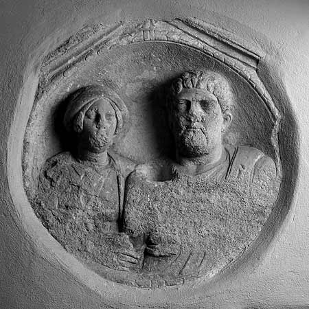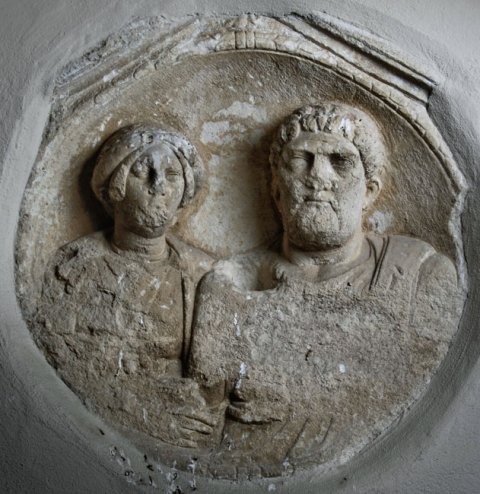 - Porträtmedaillon mit Giebel. In Lorbeerkranzrahmen zwei Brustbilder (Ehepaar). Links einheimische Frau: Haube, Umhang, Halsring mit Anhänger. Rechts Mann: bärtig, Tunica, Toga contabulata. Im Giebelzwickel Meerwesen.