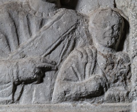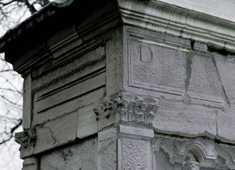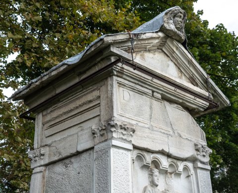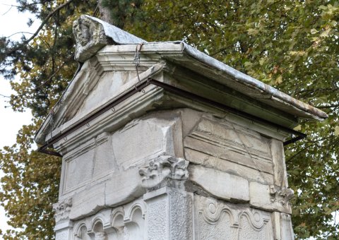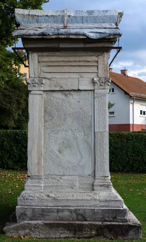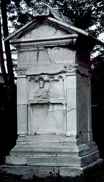 - Grabbau mit Stufenunterbau, darüber vierseitiger Aufbau aus Wänden mit Eckpilastern. Vorderseite horizontal in zwei gerahmte Felder geteilt. Unten Inschrift zwischen Säulen, nachträglich zugefügte Inschrift auf dem obenen Rahmen. Darüber drei Brustbilder einer Familie (Ehepaar mit Kind) unter vier Bögen. Frau mit Scheitelzopffrisur, Ärmeltunica und Mantel mit Borte. Knabe mit Horuslocke (?). Vom Mann nur rechte Hand erhalten. Linke Nebenseite bossiert, rechte Nebenseite mit profiliertem Rahmen (oben sogen. Barockmotiv) um bossiertes Feld. Eckpilaster mit attischen Basen und korinthischen Kapitellen, Schaftflächen bossiert. Auf dem linken Pilaster der Vorderseite ascia. Architravzone mit DM in gerahmtem Feld auf der Vorderseite, Fascien und bossierte Friese auf den Nebenseiten. Darüber profiliertes Gesims, an der Rückseite abgeschrägt. Giebelfelder ohne Relief. Satteldach aus zwei Platten mit profilierten Vorderkanten. Firstbalken mit Gorgoneion an der Stirnseite.