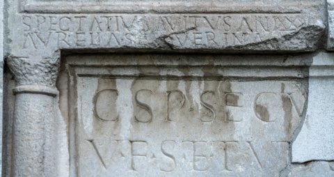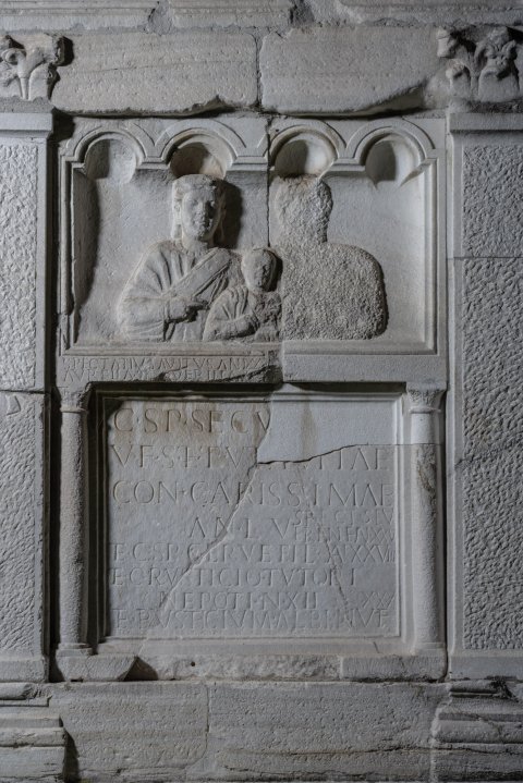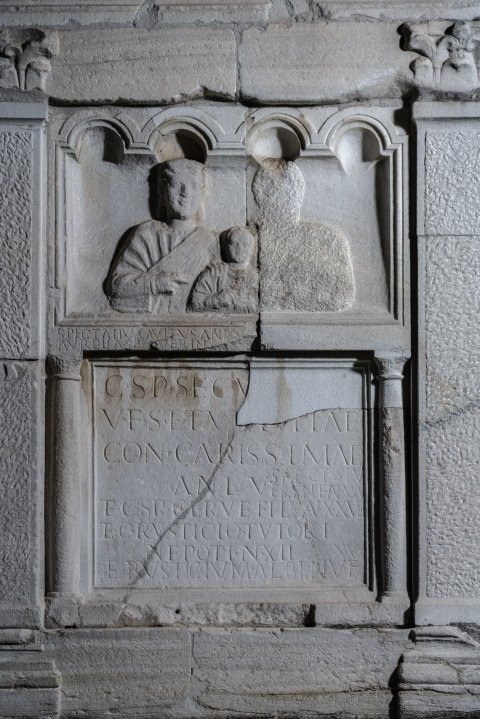 - D(is) M(anibus) // C(aius) Sp(ectatius) Secu[ndinus] / v(ivus) f(ecit) s(ibi) et Tut(oriae) Avitae / con(iugi) carissimae / an(norum) LV et C(aio) Sp(ectatio) Cerv(a)e fil(io) an(norum) XXVIII / et Rusticio Tutori / nepoti an(norum) XII / et Rusticium Albinu(m) f(ilium) / XXX Spect(atiae) Sev/erin(a)e an(norum) XXV // Spectatius Avitus an(norum) LXXX [---] / Aurelia Severina [---]
