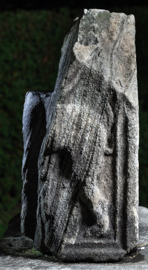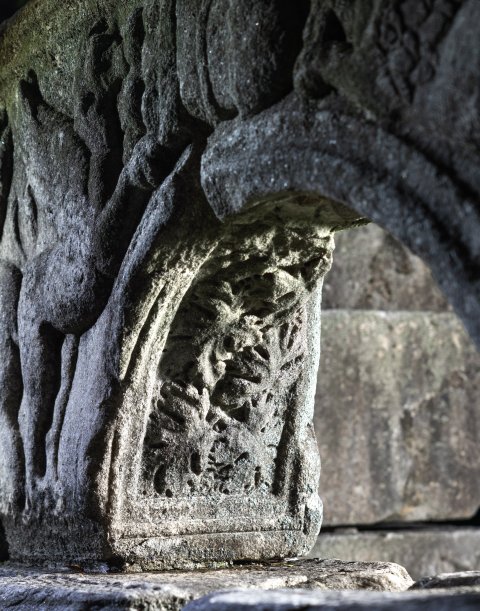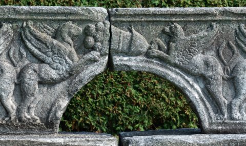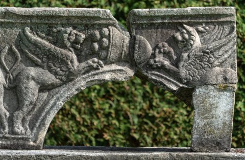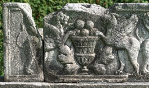- Epistylzone der linken Seitenwange einer Aedicula mit zwei Arkaden. Links Wand mit Greifenpaar, das ein großes Gefäß mit Früchten flankiert und beide Vorderpranken auf den Gefäßrand legt. Hinter dem Gefäß großes Blatt. Über den Arkaden jeweils ein umgestürztes Gefäß mit Früchten zwischen zwei Greifen. Am linken Eck setzt Teil der Rückwand der Aedicula an.