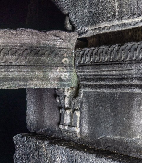 - Architravbalken, auf dem die gewölbte Decke Nr. 13350 auflag. Auf der Stirnseite Meerwesen, auf den Längsseiten Flechtbandfriese und Fascien, darüber profiliertes Gesims. Auf der Unterseite Soffitte mit bärtiger Maske zwischen Zweigen mit Blättern und Beeren. Ein Ende des Balkens ist in die Rückwand eingelassen, auf der sich nach rechts hin das Flechtband und die Fascien fortsetzen, das Gesims ist herausgemeißelt. Unter dem Ansatz des Architravs in der Rückwand korinthisches Pilasterkapitell.