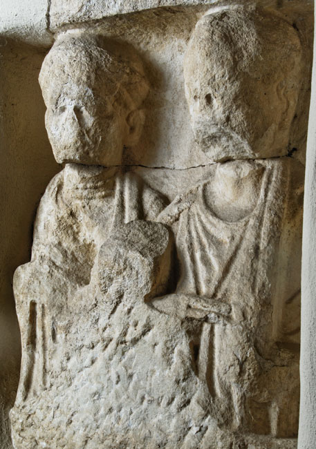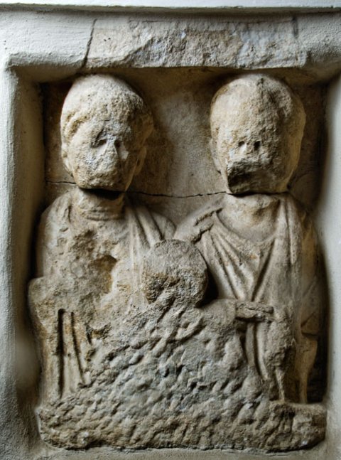 - Familie: in Rechtecknische Brustbilder eines Ehepaares mit Kind. Links einheimische Frau: Haube, Umhang, Halsketten, Lunula-Anhänger. Rechts Mann: Tunica, Toga, in der Linken Rolle (volumen). Vorn Kind.