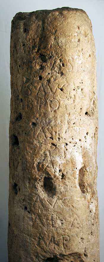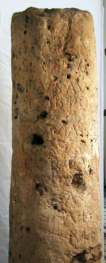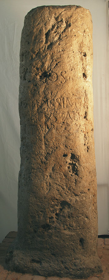 - Imp(erator) Caes(ar) [[M(arcus) [Opellius]]] / Seve<r=P>us M[acrinus] / Pius Aug(ustus) co(n)[s(ul)] proco(n)s(ul) / trib(unicia) pot[est(ate) [[et Opellius]]] / [[[Diadumenianus]]] nobilissimus / Caes(ar) vias et pontes vetustate / corruptas restituer[u]nt / cura agente [[[Aelio]]] / [[[Tric]c[iano]]] / leg(ato) Aug(usti) pro <p=R>r(aetore) / ab Aq(uinco) / m(ilia) p(assuum) XLVI