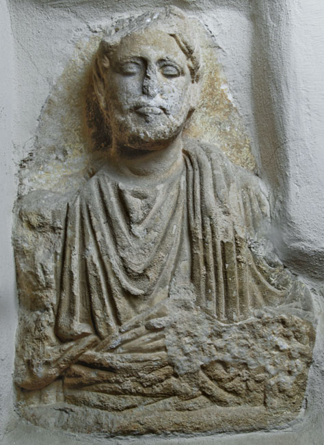 - Ehepaar. Auf dem rechten Fragment Mann (Brustbild): bärtig, Locken, Tunica, Toga, in der Linken Rolle (volumen). Links schloss Frauenporträt an, rechts 1281.