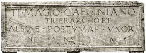 - Ti(berio) Magio Caeciniano / trierarcho et / Alsiae Postumae uxori / n(on) f(ui) n(on) s(um) n(on) c(uro)