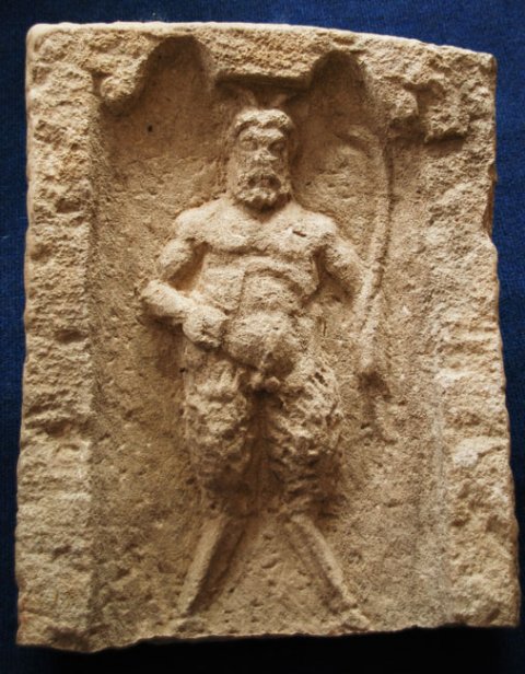 - Mythische Figur: gerahmte Tafel, Rahmen oben doppelt geschwungen mit Volutenenden. Frontal stehender Silvanus - Pan mit Ziegenbeinen und Hörnern, im linken Arm Pedum, in der rechten Hand Winzermesser (?).