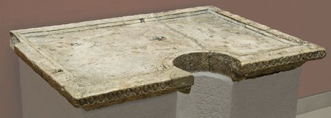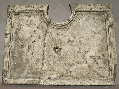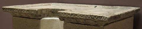 - Rechteckige Platte eines Monopodium mit halbrunder Einziehung in der Mitte einer Längsseite. Auf der Oberseite profilierter Leistenrahmen. Auf den Kanten rechts und links der halbrunden Ausnehmung vereinfachter Eierstab, darunter Kyma mit Akanthusblattfries. An den anderen drei Seiten Kyma mit Akanthus-Lotus-Ranke.