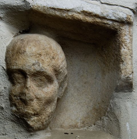 - Mann (Ehepaar / Familie): in Giebelnische rechts bärtiger Kopf, im Zwickel oberhalb des Giebels Meerwesen (Delphin)