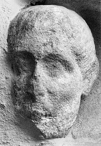 - Fragment, rechte Seite glatt (fein gespitzt), verwittert, nur Kopf des Mannes und rechte obere Ecke des Rahmens erhalten